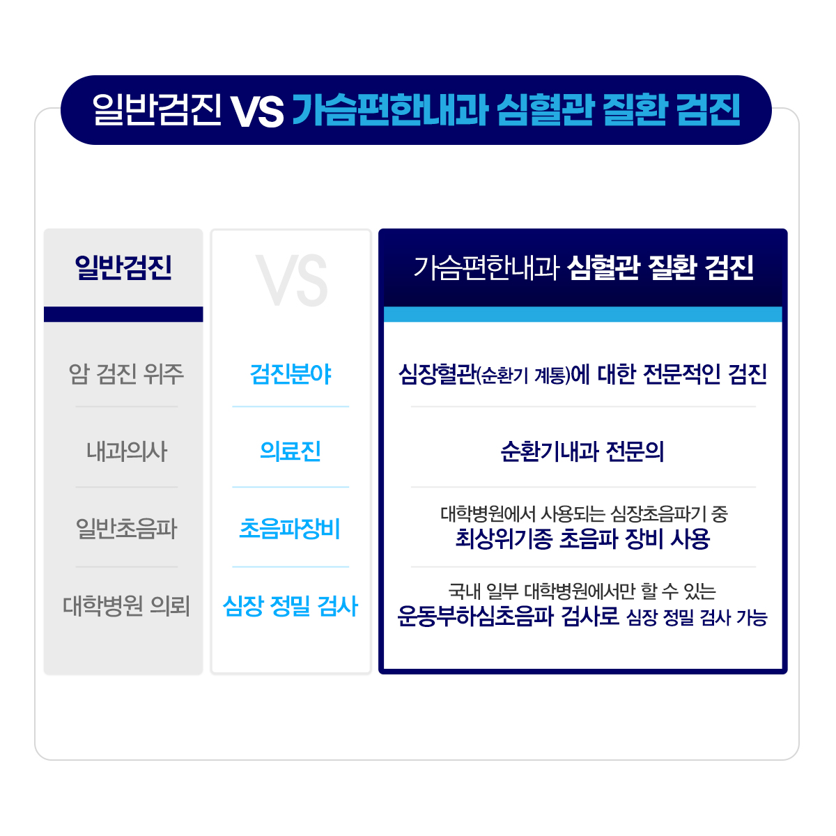 | 비교 항목 | 일반 내과·검진센터 | 심장 전문병원(가슴편한내과) |